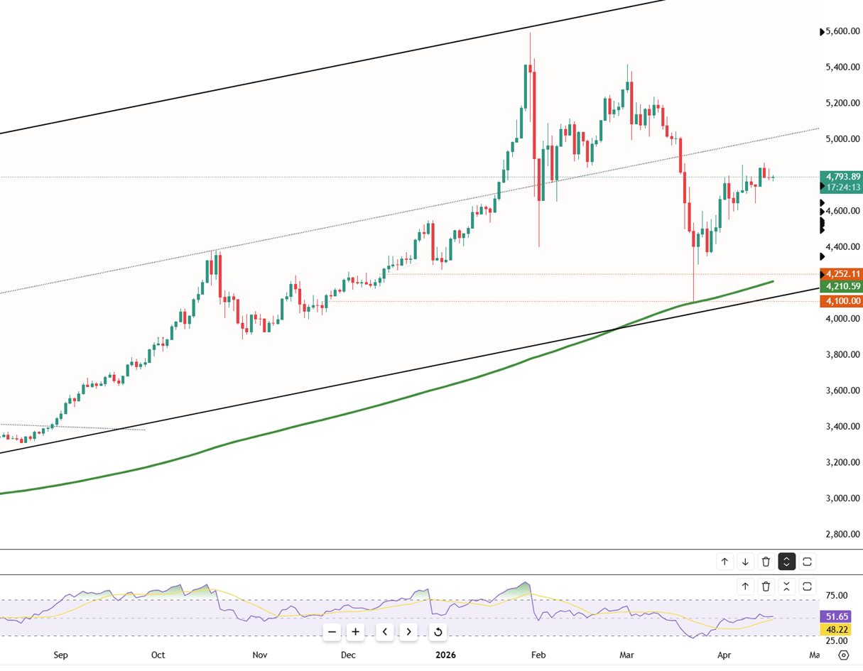 Gold held firm near $4,800 on Friday, heading for a fourth consecutive weekly rise. While doubts remain regarding reported peace terms, optimism over a potential US–Iran ceasefire has dampened inflation fears and interest rate expectations, providing consistent support for the precious metal.