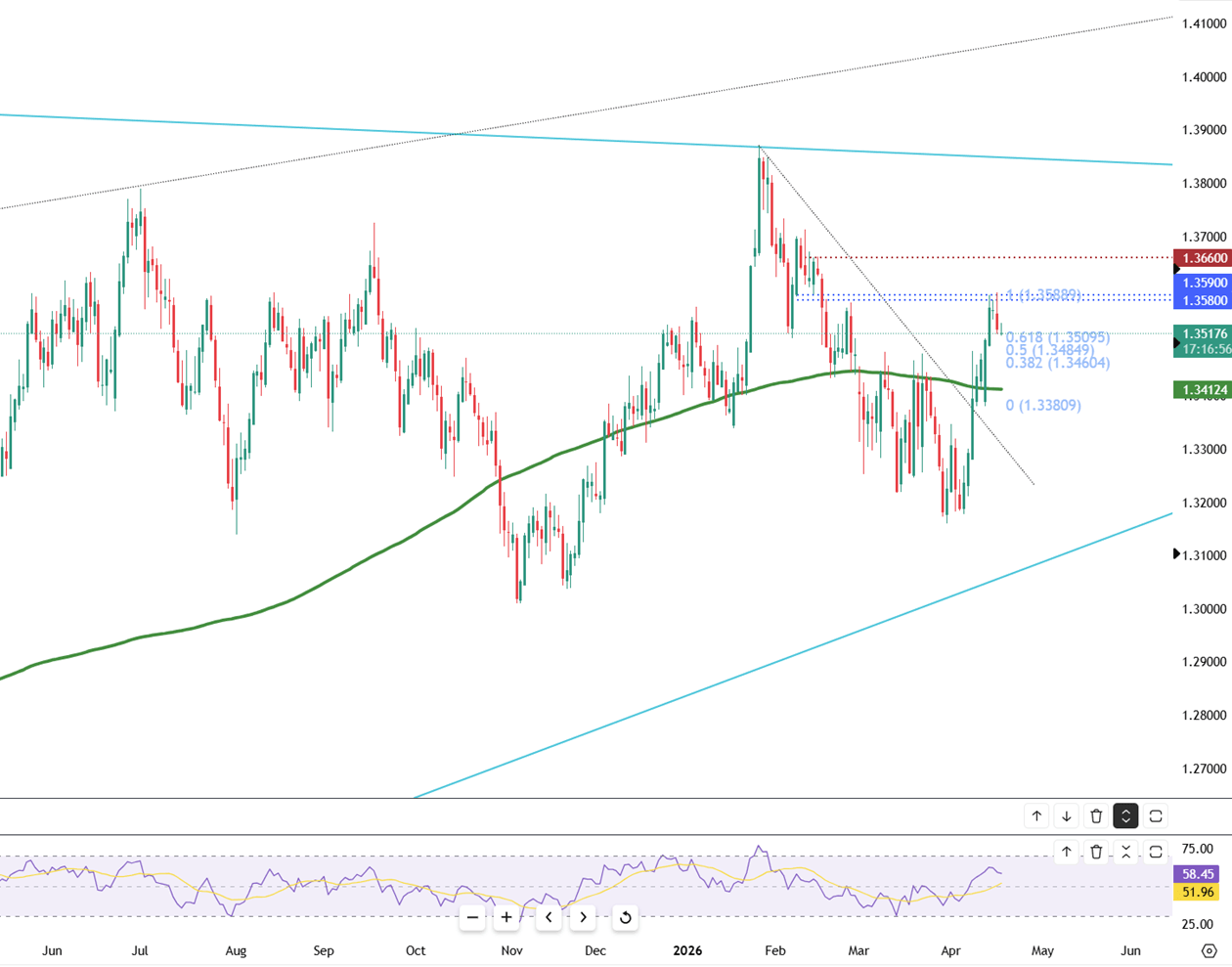 From a technical view, support stands near 1.3600, with resistance around 1.3500.