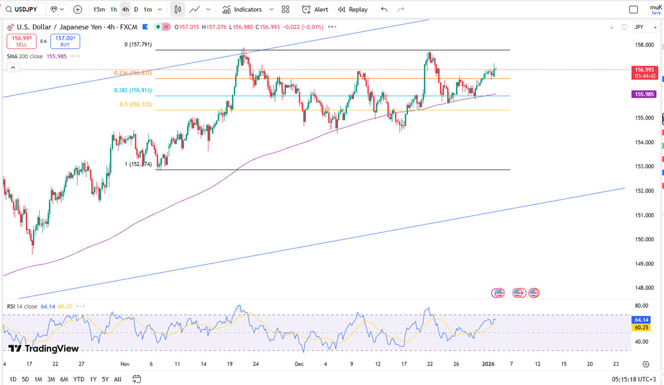 Technically, resistance stands near 157.50, while support is firm at 156.70.