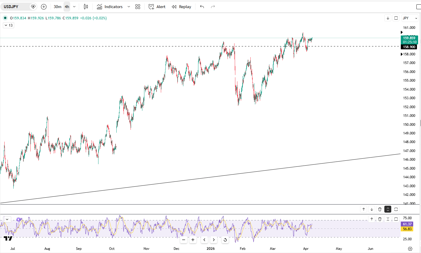 Technically, resistance stands near 159.90, while support is firm at 158.50.