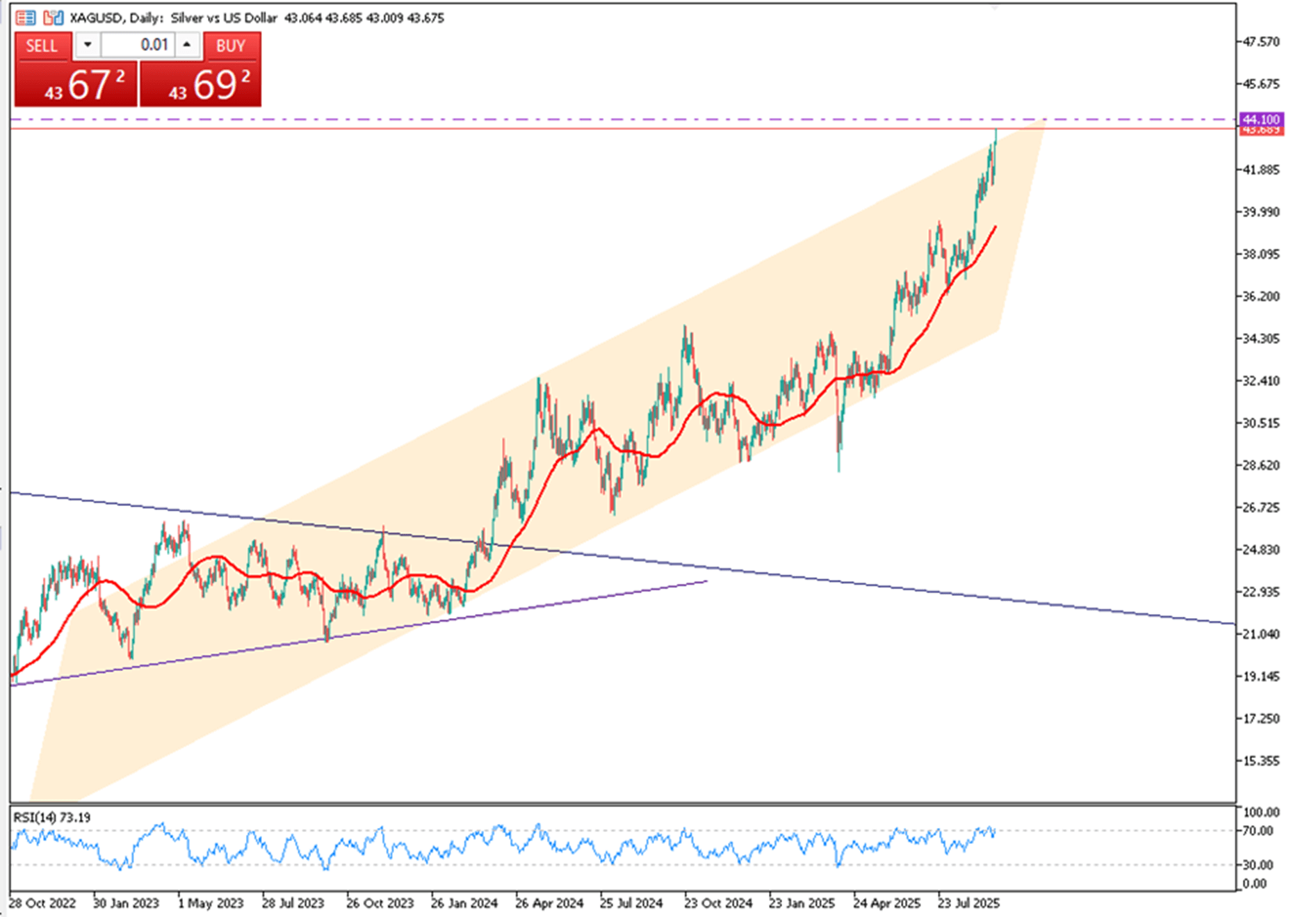 Silver (XAG/USD) extended Friday’s breakout, hitting $43.25, its strongest level since September 2011, during Monday’s Asian session. Up 0.35% on the day, the metal is testing the top of an ascending channel that began in April, reinforcing the uptrend and potential for further gains. Still, slightly overbought RSI signals a short-term pullback or consolidation before the next bullish leg.