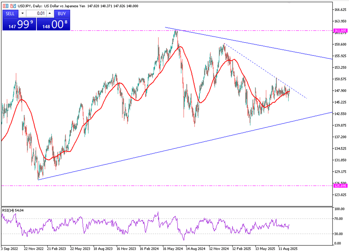 The Japanese yen fell to a two-week low against the dollar on Monday, weighed by uncertainty over the Bank of Japan’s policy outlook. Political instability and US tariff concerns may delay BoJ hikes, while a stronger USD and improved risk sentiment added pressure. Still, the BoJ is expected to continue gradual normalization, contrasting with the Fed’s dovish stance of two more cuts this year. This divergence could eventually support the yen and limit USD upside. Traders now await remarks from Fed officials for direction.
