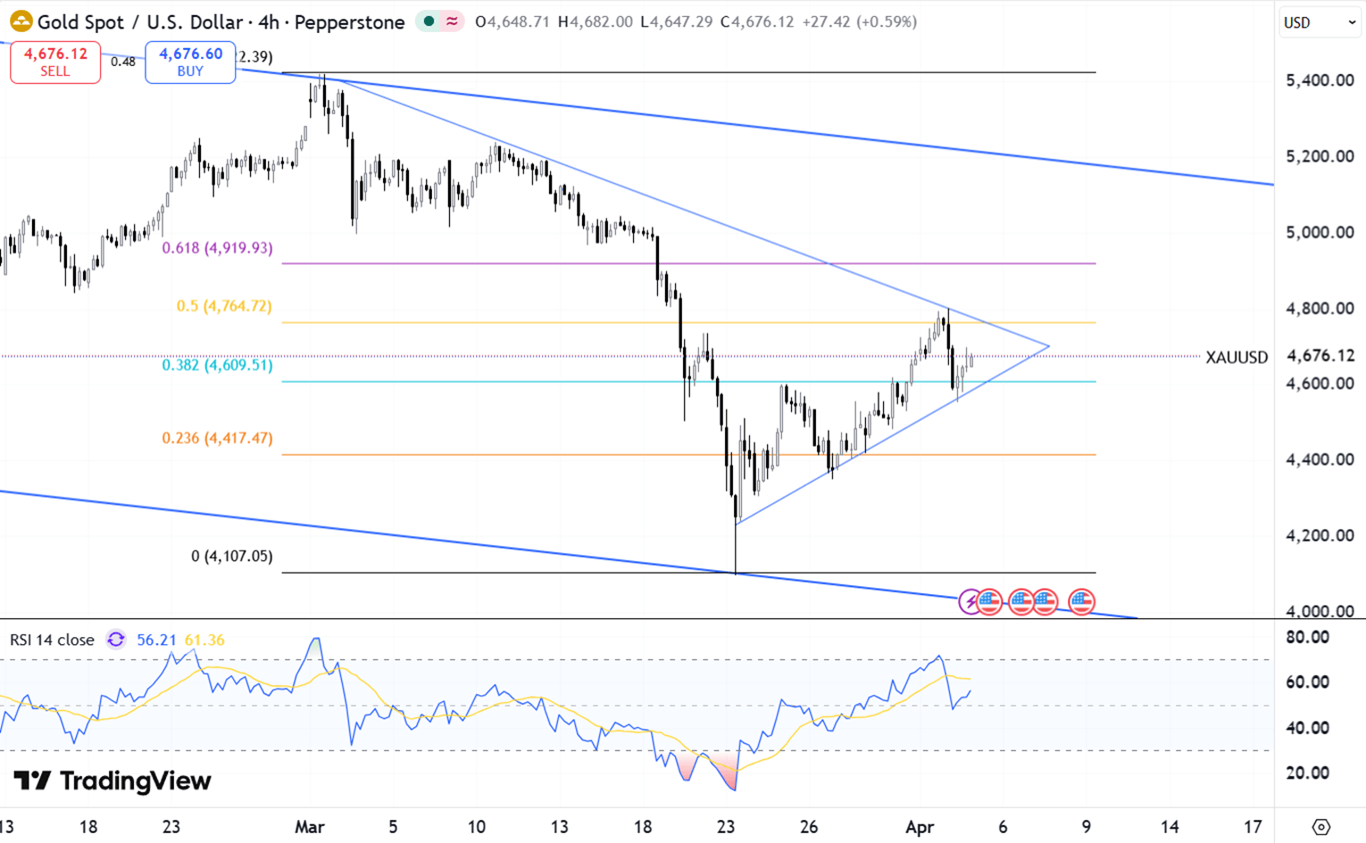 Gold is attempting to stabilize around $4,700 following its recent retreat, aided by modest buying interest. Technically, the metal remains below its primary trendline, which may cap near term gains. Resistance is firmly set at $4,850. With markets closed for Good Friday, investors should expect potential volatility at Monday’s opening as the metal reacts to weekend geopolitical developments.