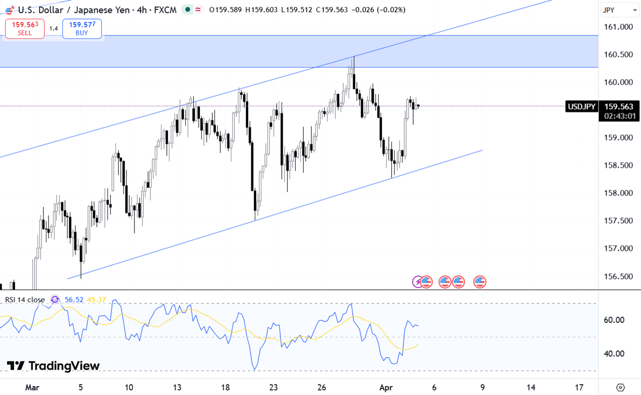 Technically, resistance stands near 159.80, while support is firm at 158.50.