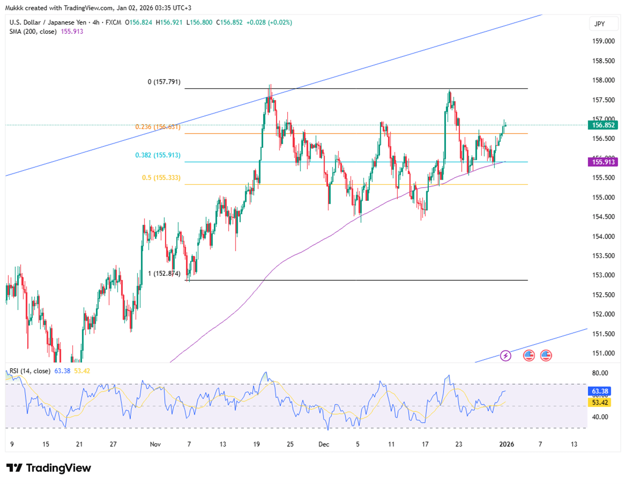 Technically, resistance stands near 157.30, while support is firm at 156.20.