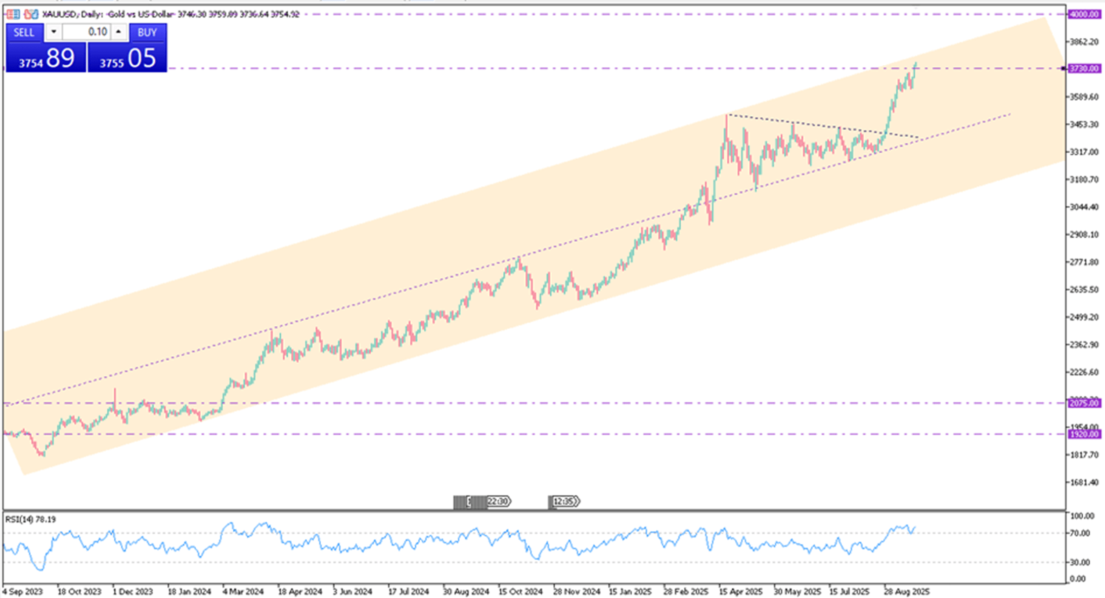 Gold climbed above $3,750 per ounce on Tuesday, supported by expectations of further interest rate cuts from the Federal Reserve this year. After last week’s initial reduction, the Fed signaled that additional easing may follow as the labor market weakens, with markets now pricing in nearly two more 25-basis-point cuts before year-end.