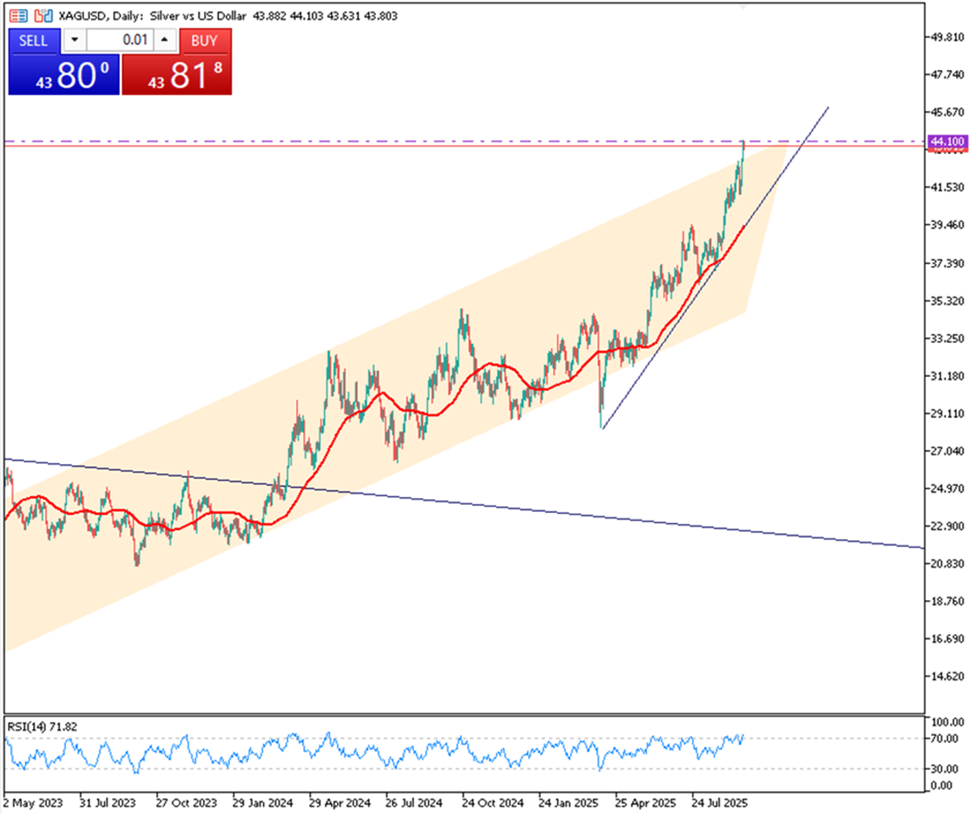 Silver retreated after reaching fresh 14-year highs, trading near $43.80 per ounce during Tuesday’s Asian session. The pullback reflected a technical correction, compounded by cautious remarks from several US Federal Reserve officials on Monday. Still, strong fundamentals remain in place, with tight supply continuing to underpin upward momentum for the metal.
