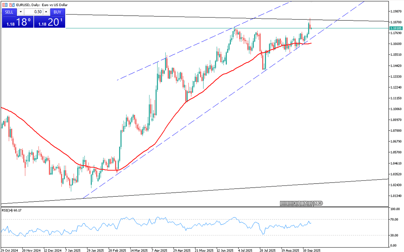 The euro hovered near $1.18, just below four-year highs, as the dollar firmed after the Fed’s 25 bps rate cut. Chair Powell called it “risk management” and hinted at another 50 bps of easing this year. The ECB left rates unchanged, with officials warning of risks from tariffs, inflation, and fiscal policies. Eurozone inflation eased to 2.0% in August, slightly under forecasts.