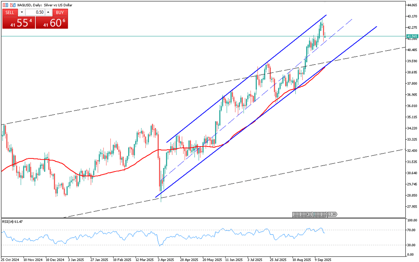 Silver slipped below $41.5 on Thursday, extending a three-day decline after the Fed’s 25 bps cut. The central bank signaled two more cuts this year but only one in 2026, tempering easing expectations. Powell called the move “risk management” amid labor weakness. The BoC also cut rates, while the BoE and BoJ are set to hold. Industrial demand from solar, EVs, and electronics, plus supply constraints, continues to support silver.