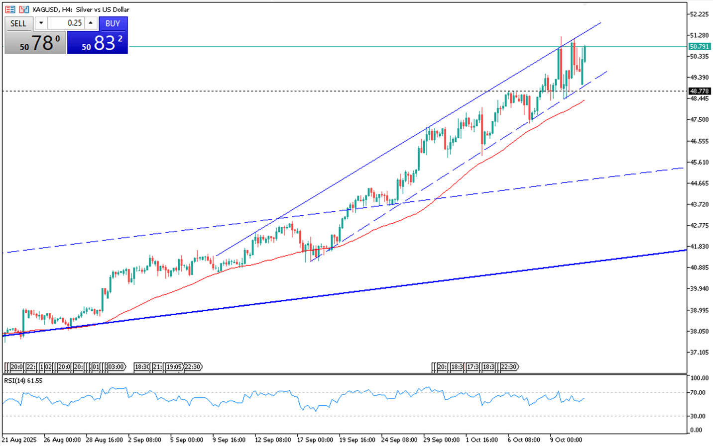 Silver jumped over 2% to above $51 per ounce, hitting a record high as U.S.–China trade tensions, political uncertainty, and Fed rate-cut expectations fueled safe-haven demand. Trump threatened 100% tariffs on Chinese goods but later signaled readiness to negotiate with Xi. Geopolitical risks, including the U.S. shutdown, French turmoil, and Japan’s leadership uncertainty, added support, while tightening London silver supply extended the rally.