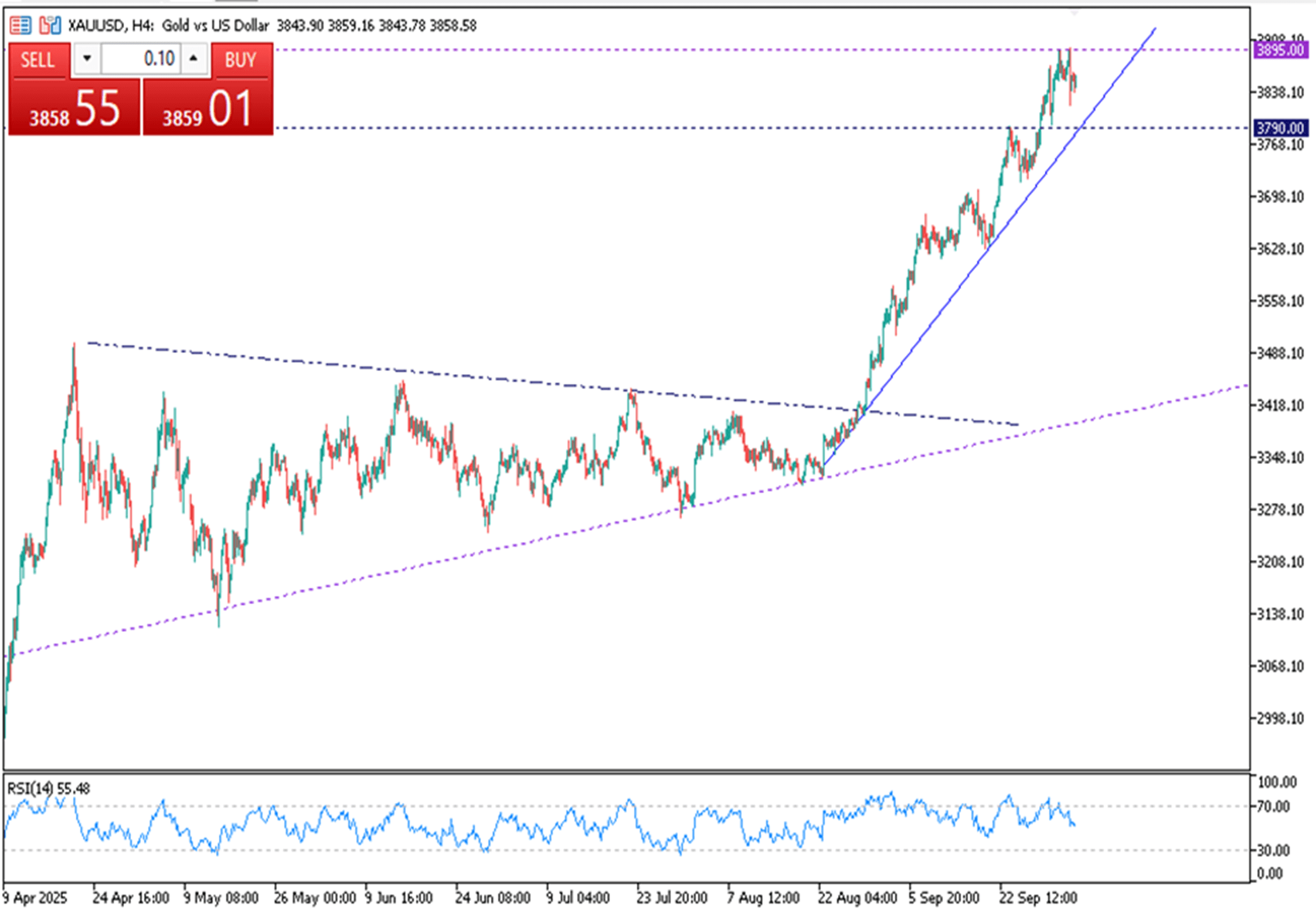Gold traded near $3,850 per ounce on Friday, on track for a seventh consecutive weekly gain after hitting a fresh high earlier in the week. The metal remained supported by stronger safe-haven demand and expectations of a more dovish Federal Reserve. Uncertainty has intensified with the partial US government shutdown, which threatens federal jobs and could delay key data releases such as non-farm payrolls.