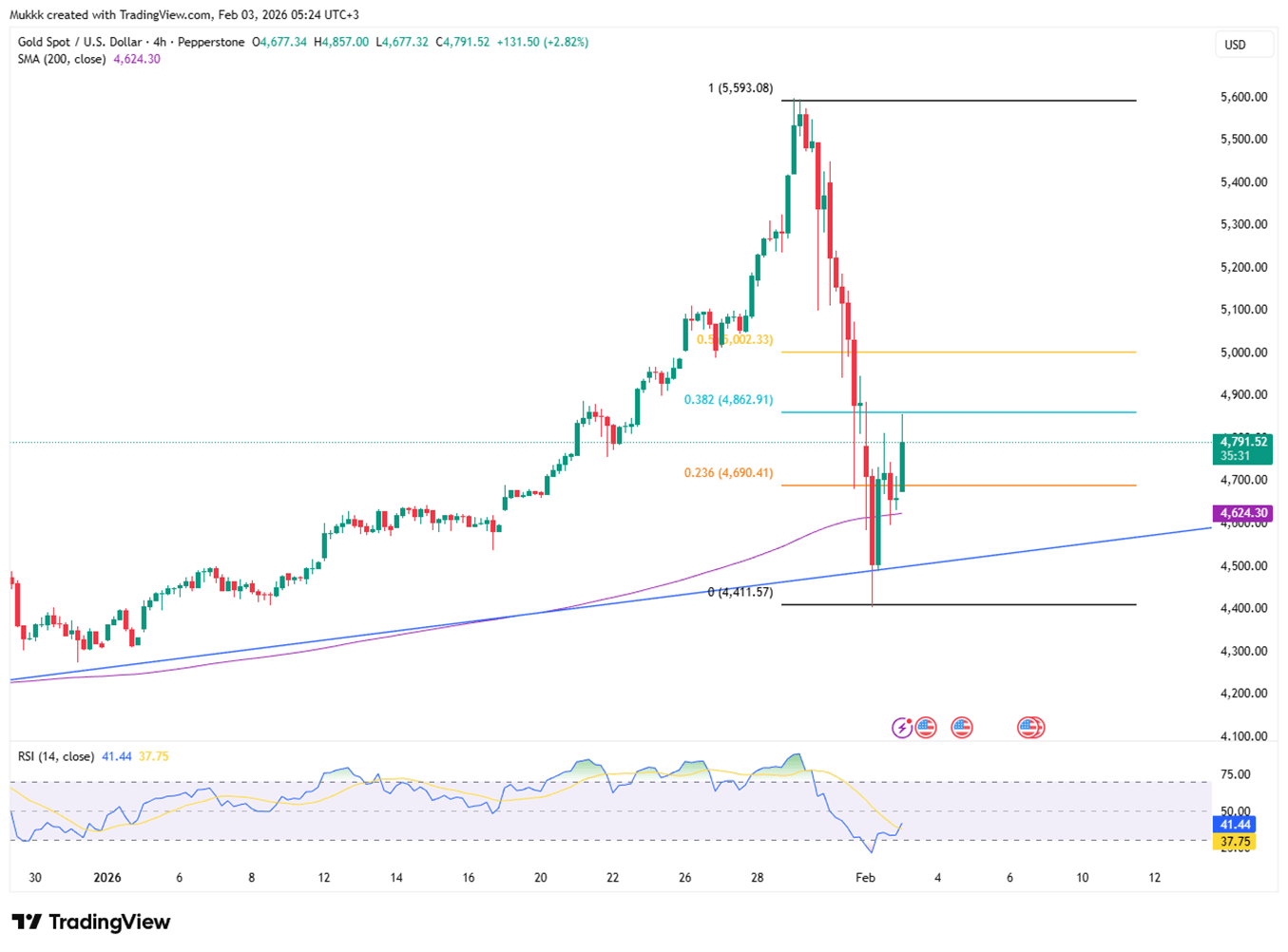 Gold sees support near $4705, while resistance is around $4860.