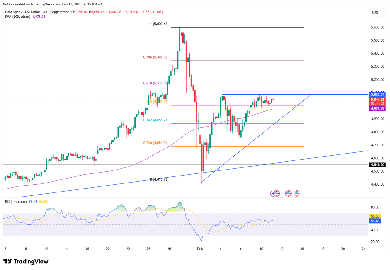 Gold sees support near $5000, while resistance is around $5095.
