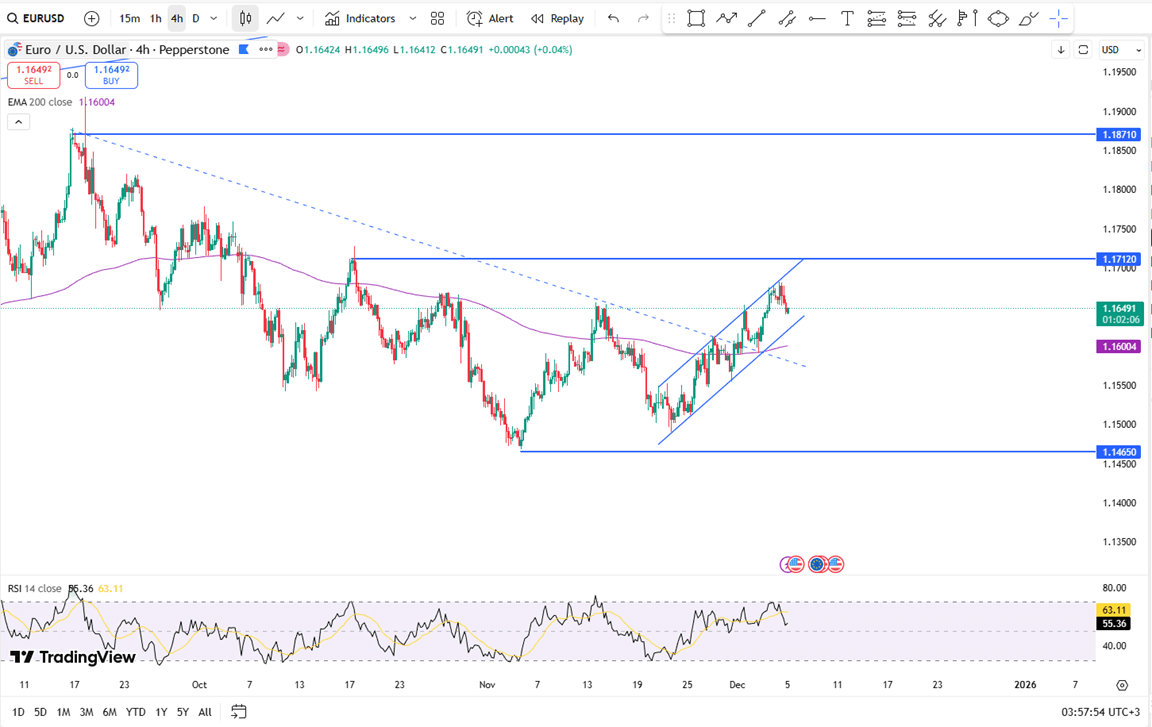 EUR/USD recovered into the mid-1.16s after Thursday’s dip, supported by steady Eurozone fundamentals and inflation near target, reinforcing the view that ECB policy will stay unchanged through 2026.