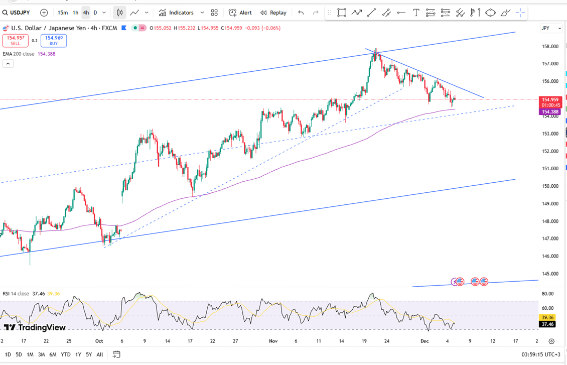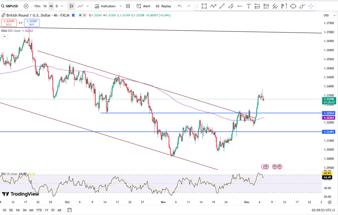 GBP/USD held around 1.3320 as expectations for coordinated easing by both the Fed and the Bank of England guided flows. The BoE is widely expected to deliver a 25 bps cut in December before pausing on concerns that inflation could pick up again. Meanwhile, US markets continue to anticipate a third Fed cut next week, along with further reductions in 2026, offering relative support to the pound.
