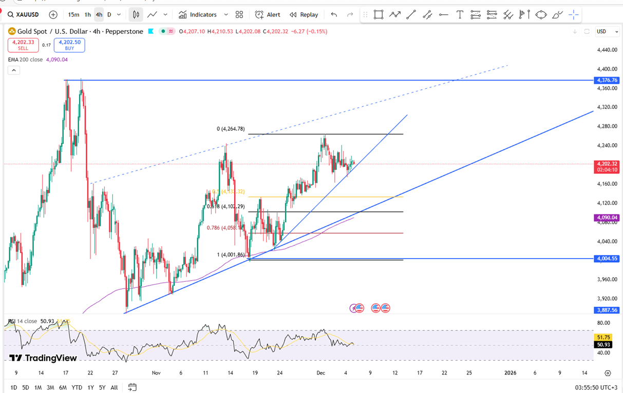 Gold finds support near $4,170, with the first resistance level around $4,260.