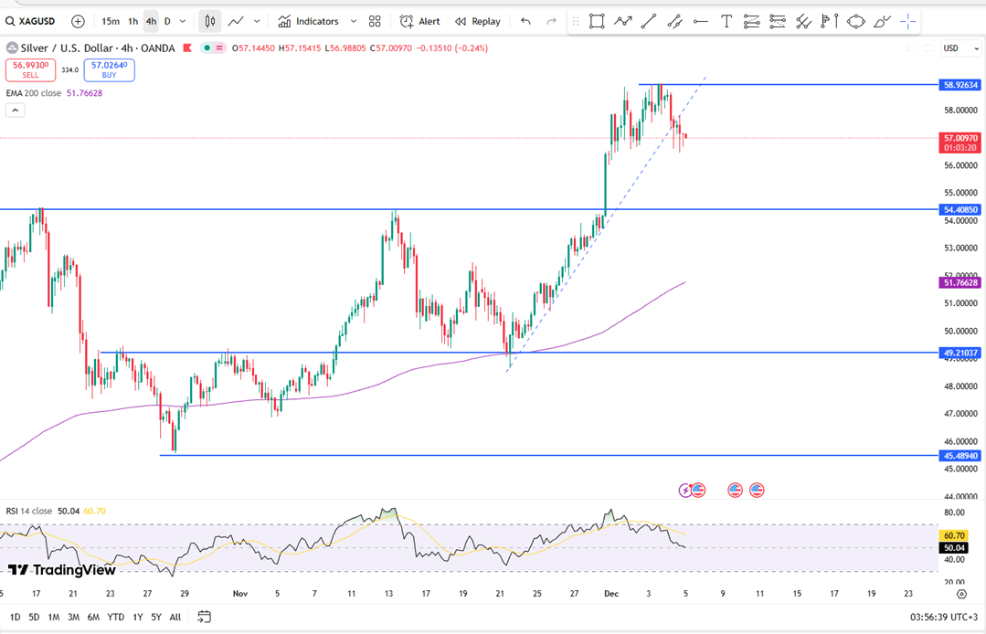 XAG/USD meets first resistance near $58.50, with support set around $56.90.