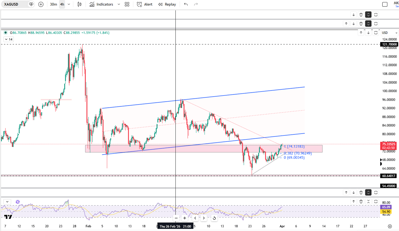Silver retreated toward $74 per ounce on the first trading day of April, extending a dramatic 20% decline from March, its sharpest monthly drop since September 2011. The metal now sits nearly 40% below its January peak, pressured by energy-led inflation that has forced central banks to adopt a more aggressive interest rate stance. Investors have abandoned previous forecasts for two US rate cuts in 2026, pivoting instead toward higher for longer expectations. Although easing Middle East tensions offered brief stability, overall market sentiment remains remarkably fragile.