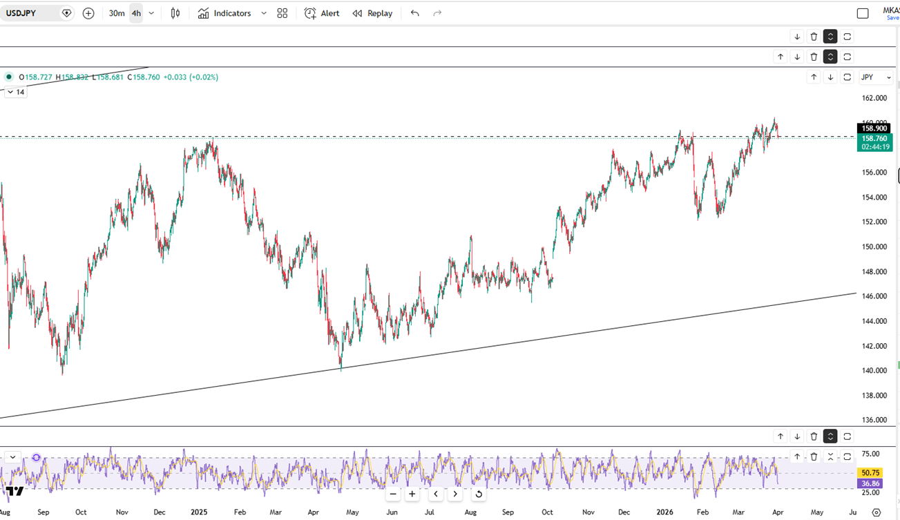 Technically, resistance stands near 160.50, while support is firm at 158.50.