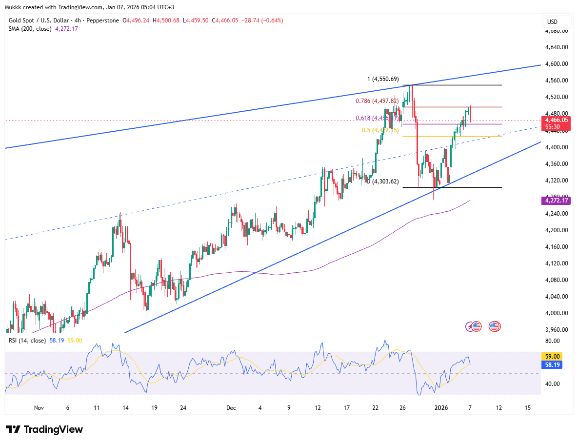 Gold sees support near $4425, while resistance is around $4520.
