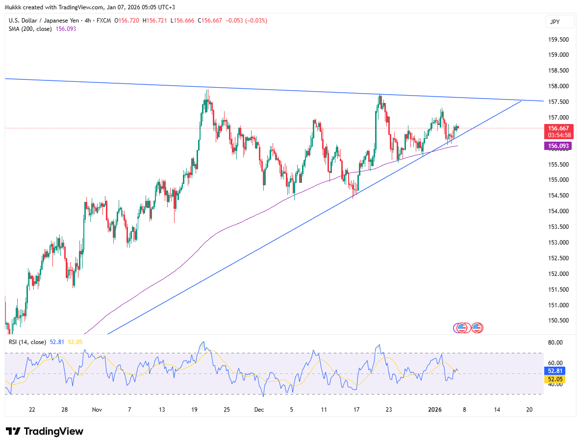 Technically, resistance stands near 157.20, while support is firm at 156.10.