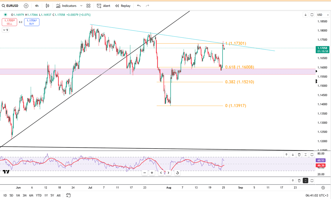 EUR/USD hovered around 1.1700 in Monday’s Asian session, easing after a 1% surge in the previous day. The downside remains limited as the US Dollar stays under pressure, with markets increasingly betting on a Fed rate cut in September. Speaking at the Jackson Hole symposium, Fed Chair Jerome Powell flagged rising labor market risks while stressing that inflation is still elevated and policy decisions are not preset. He noted the Fed may avoid tightening based on uncertain assumptions about employment levels. Following his comments, CME FedWatch showed an 85% chance of a 25 bps cut next month, up from 75% before the speech. Focus now shifts to US Q2 GDP and July PCE inflation data, which could guide dollar moves and EUR/USD direction.