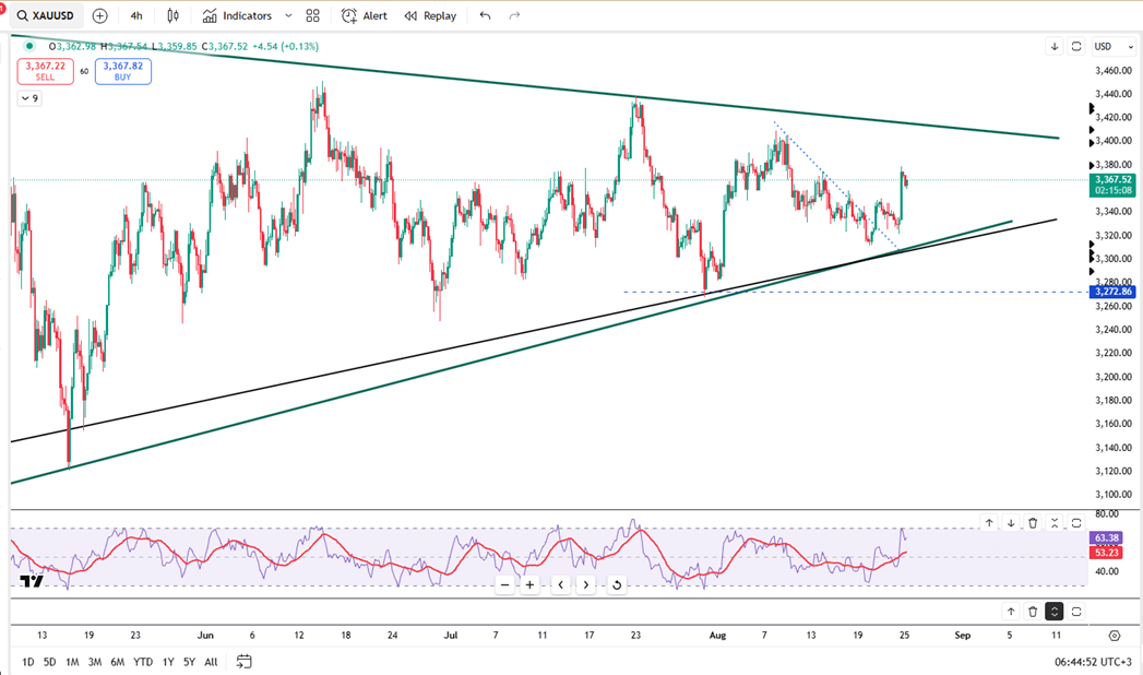 Gold retreated below $3,365 on Monday, reversing part of Friday’s sharp gains. Volatility followed Powell’s dovish tone at Jackson Hole, which boosted the likelihood of a September rate cut. CME FedWatch placed those odds at 88%, up from 75% before his remarks.