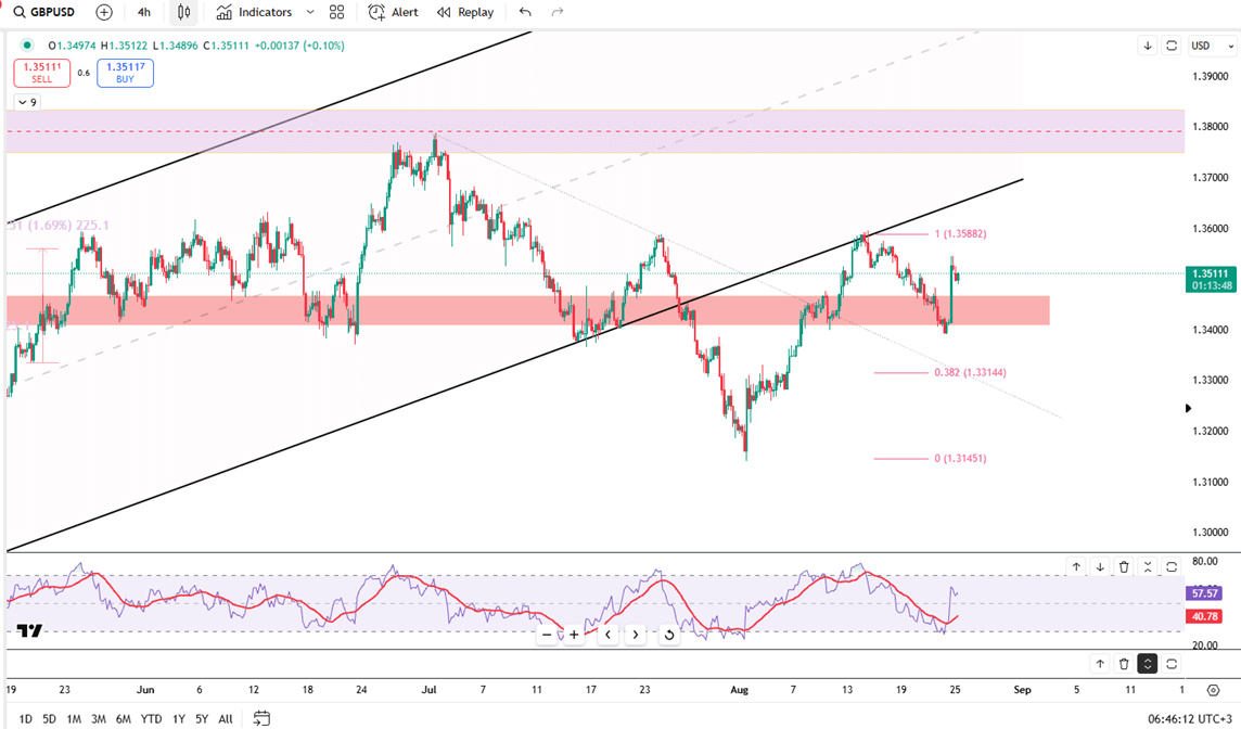 GBP/USD hovered around 1.3495, pressured by fresh US Dollar demand. Losses were limited, however, after Powell’s dovish remarks at Jackson Hole fueled speculation that the Fed could cut rates as soon as September. He flagged a “challenging situation” with inflation risks on the upside and employment risks on the downside, raising easing expectations. Traders now await US New Home Sales and the Chicago Fed National Activity Index for fresh direction. While short-term pressure weighs on sterling, Fed-driven policy expectations may offer support and prevent deeper losses.