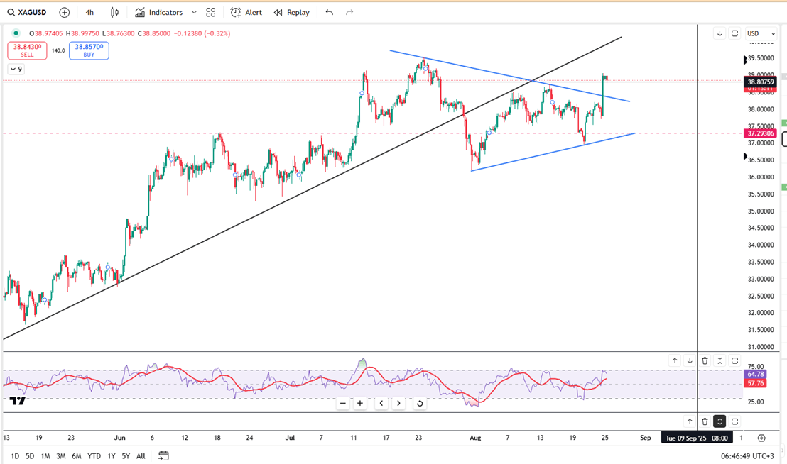 Silver traded near $38.80 in Monday’s Asian session, ending a three-day rally after nearly 2% gains in the prior session. Powell’s Jackson Hole remarks boosted Fed cut expectations for September, which continue to support silver despite the pullback. He noted risks to the labor market but warned inflation remains volatile, stressing that no decision is finalized. While silver’s rally paused, policy easing expectations and strong industrial demand, including from the solar sector, keep sentiment positive and downside risks limited.