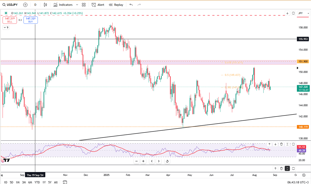 USD/JPY traded near 147.40, recovering from a 1% fall last session. Upside momentum may be capped, however, as hawkish commentary from BoJ Governor Kazuo Ueda lends support to the yen. At Jackson Hole, Ueda suggested conditions for another rate hike are taking shape, with wage gains spreading beyond major firms and likely to accelerate in Japan’s tight labor market.