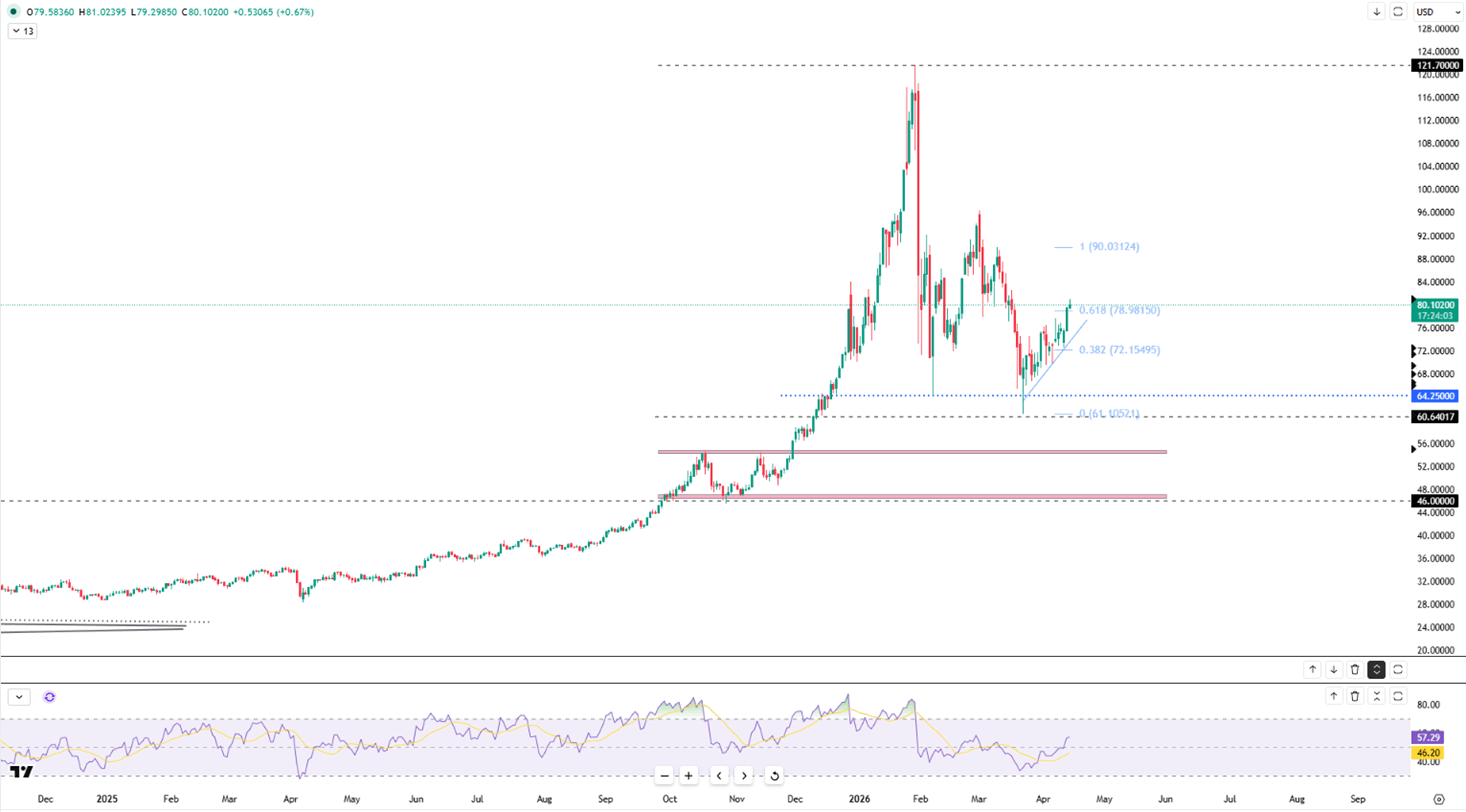 Silver maintained its position above $79 on Wednesday after a powerful 5% rally, driven by the prospect of a US–Iran settlement. This diplomatic shift has mitigated fears of a massive inflation spike linked to energy costs. While the US naval blockade persists, Tehran’s potential move to pause oil shipments is seen as a gesture to facilitate upcoming talks in Islamabad. Further aiding the metal’s ascent are retreating oil prices, which have slipped under $100, and a weakening dollar that recently touched a six-week low.