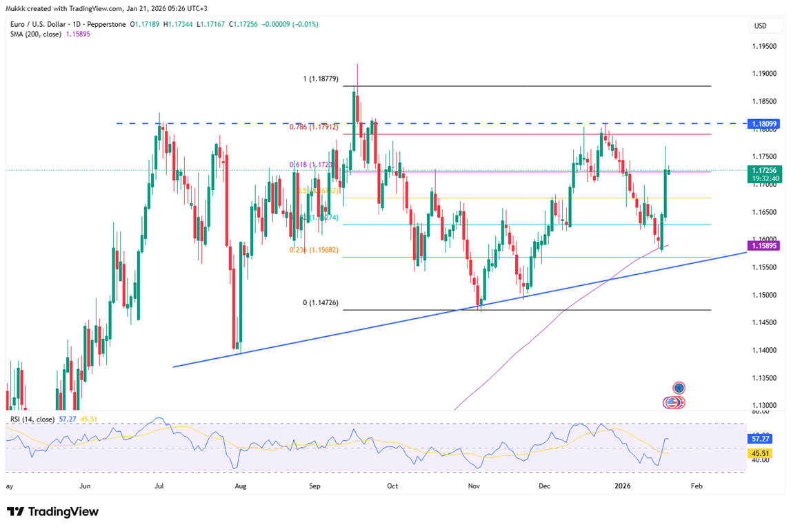 The euro climbed above 1.17 after a sharp rise in German ZEW sentiment boosted confidence in the region’s outlook, while renewed U.S.–EU trade tensions weakened the dollar. The yen stayed rangebound amid fiscal and political uncertainty in Japan, as gold and silver surged on strong safe-haven demand driven by the Greenland dispute. Sterling rebounded on dollar softness and UK jobs data, though tariff risks continue to cloud the outlook.