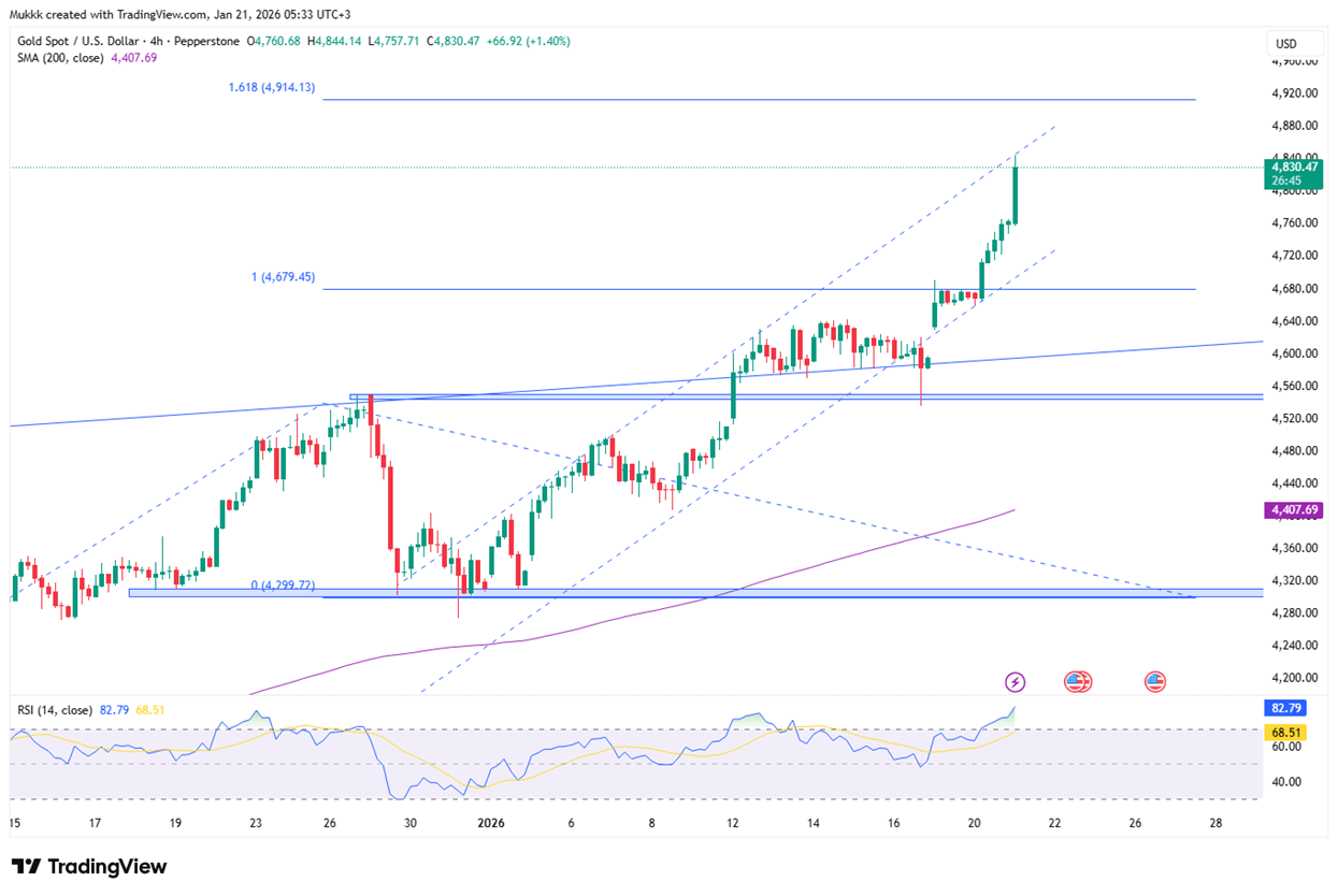 Gold soared past $4,800 on Wednesday, reaching a new all-time high as the U.S.–Europe standoff over Greenland intensified. At the Davos forum, President Trump’s renewed vows to acquire the island and his accompanying tariff threats triggered a shift into safe-haven assets. This geopolitical friction, alongside instability in Japanese bonds, reinforced gold's dominance as investors await delayed U.S. PCE data for future rate clues.