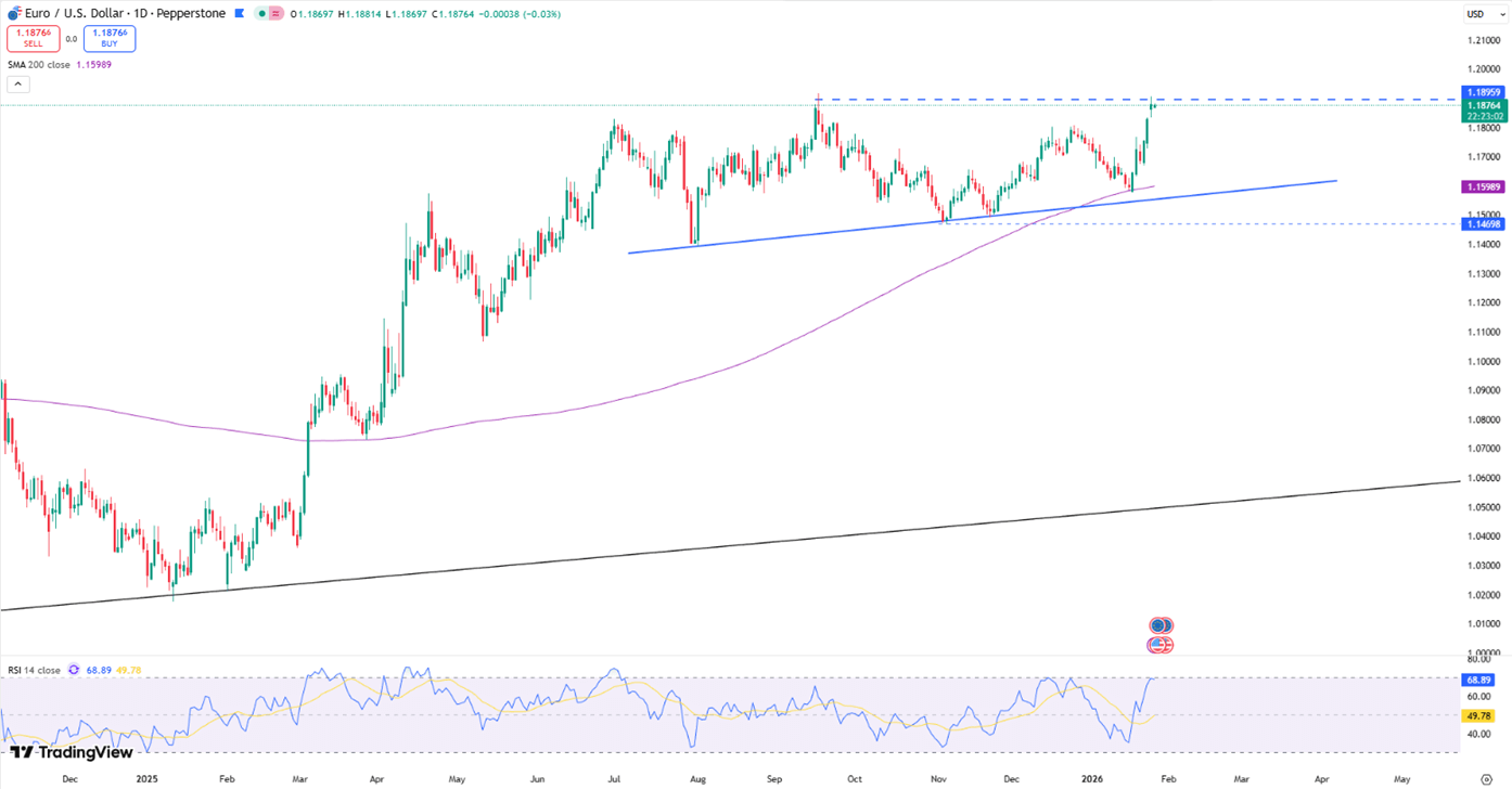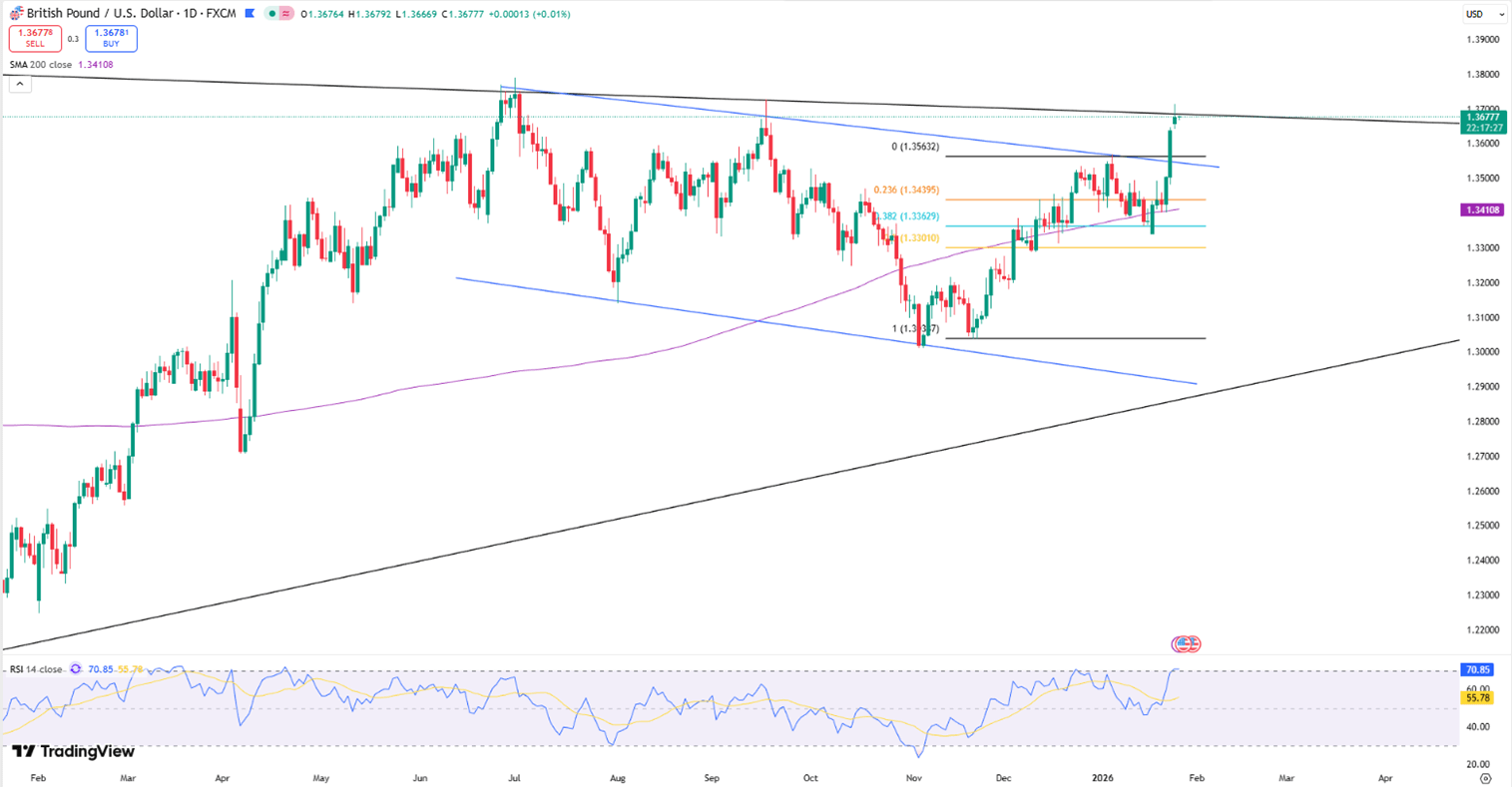GBP/USD rose at the start of the week, testing 1.3700 for the first time since September. Despite the Trump administration’s threats of new tariffs on European nations over the Greenland dispute, markets largely dismissed the rhetoric as temporary. This resilience in risk appetite, combined with broad dollar softness, helped the pound maintain its upward momentum.