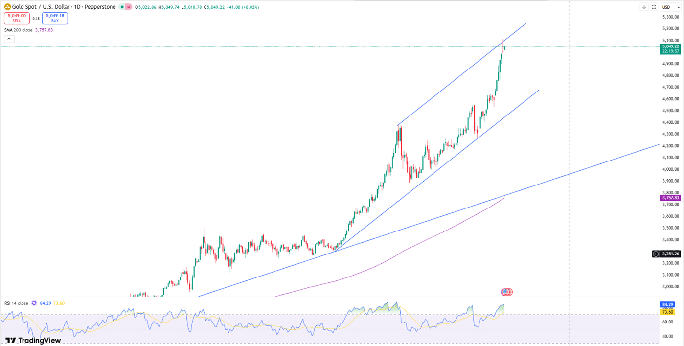 Gold sees support near $5000, while resistance is around $5090.