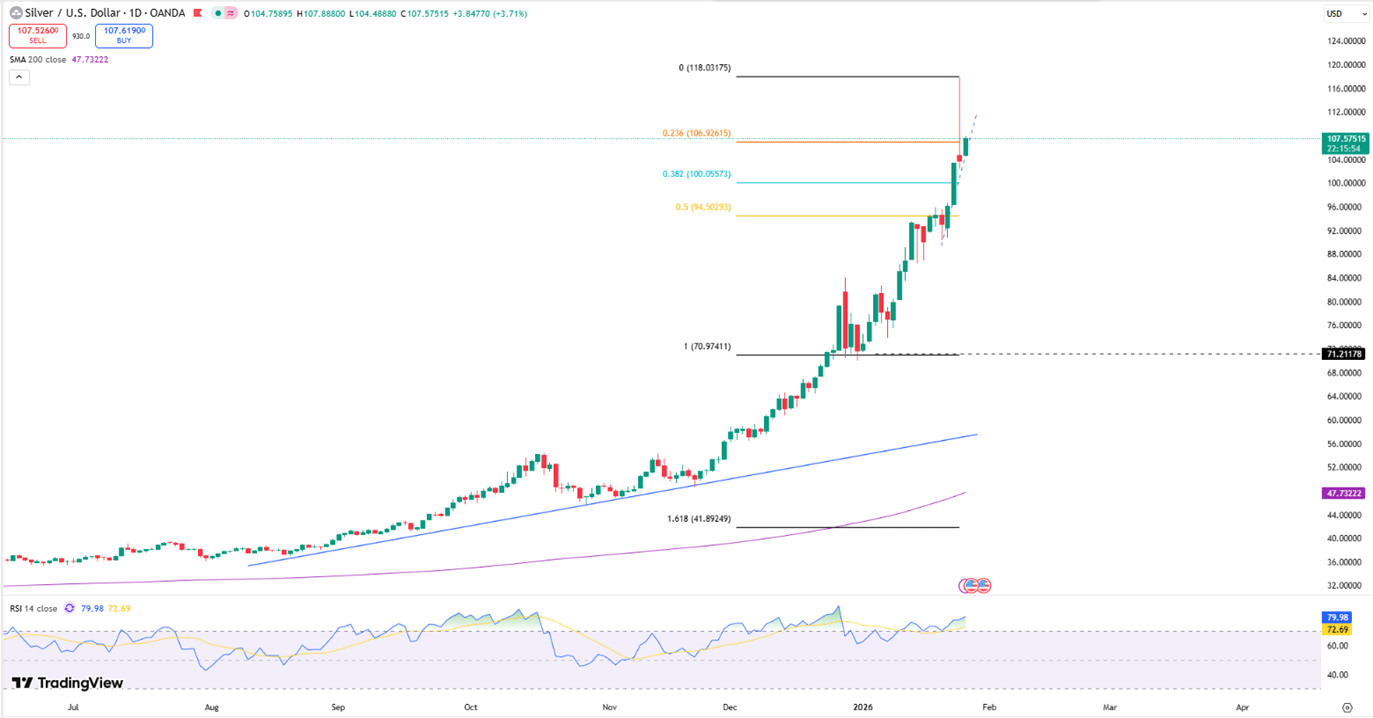 Precious metals witnessed a significant rally, with silver jumping over 6% to surpass $110 and gold climbing above $5,070 amid safe-haven demand. Meanwhile, the dollar index remained at a four-month low of 97, weighed down by concerns over Fed independence and potential political shifts.