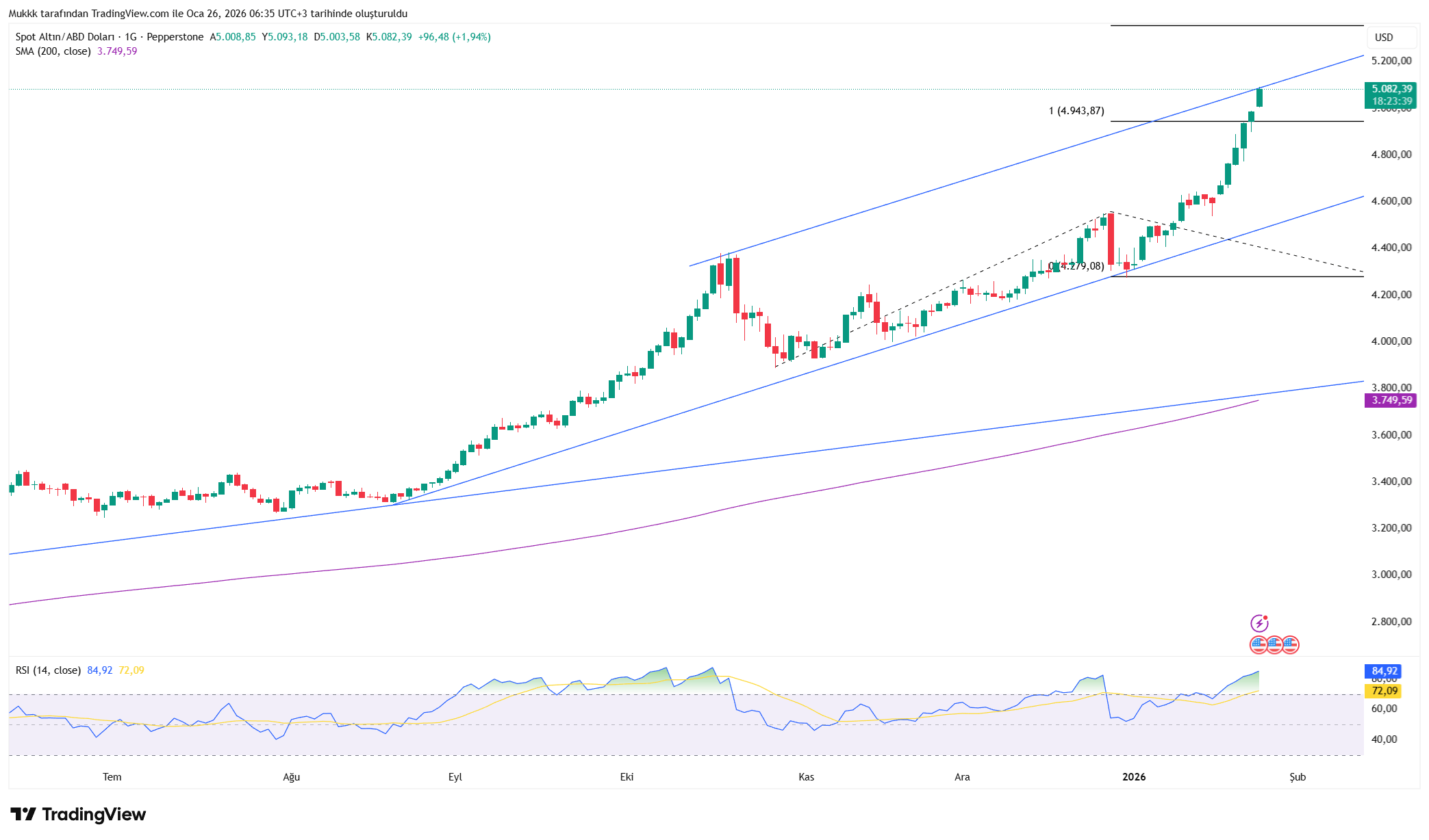 Gold sees support near $5000, while resistance is around $5090.