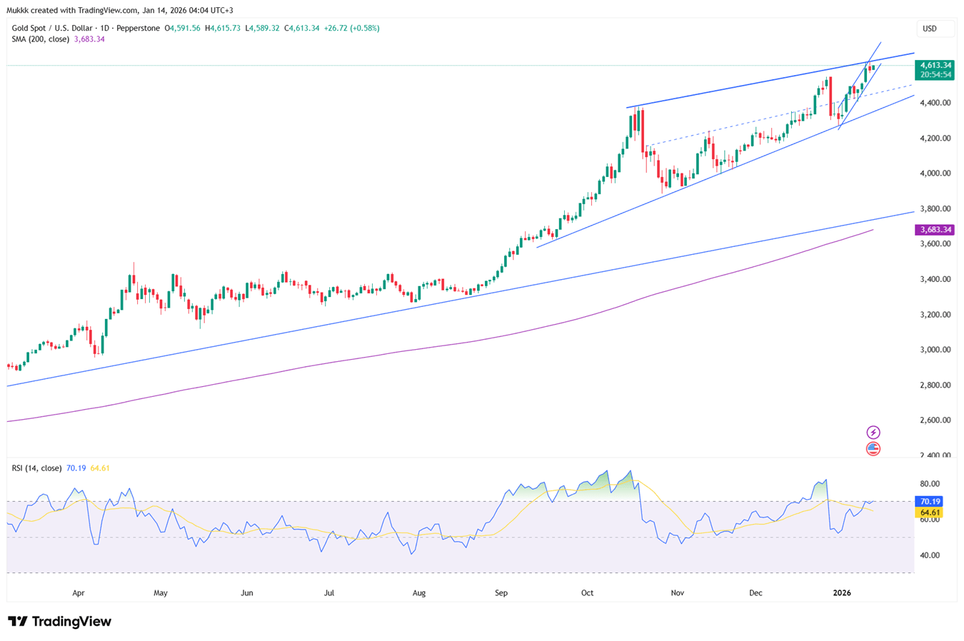 Gold sees support near $4590, while resistance is around $4650.