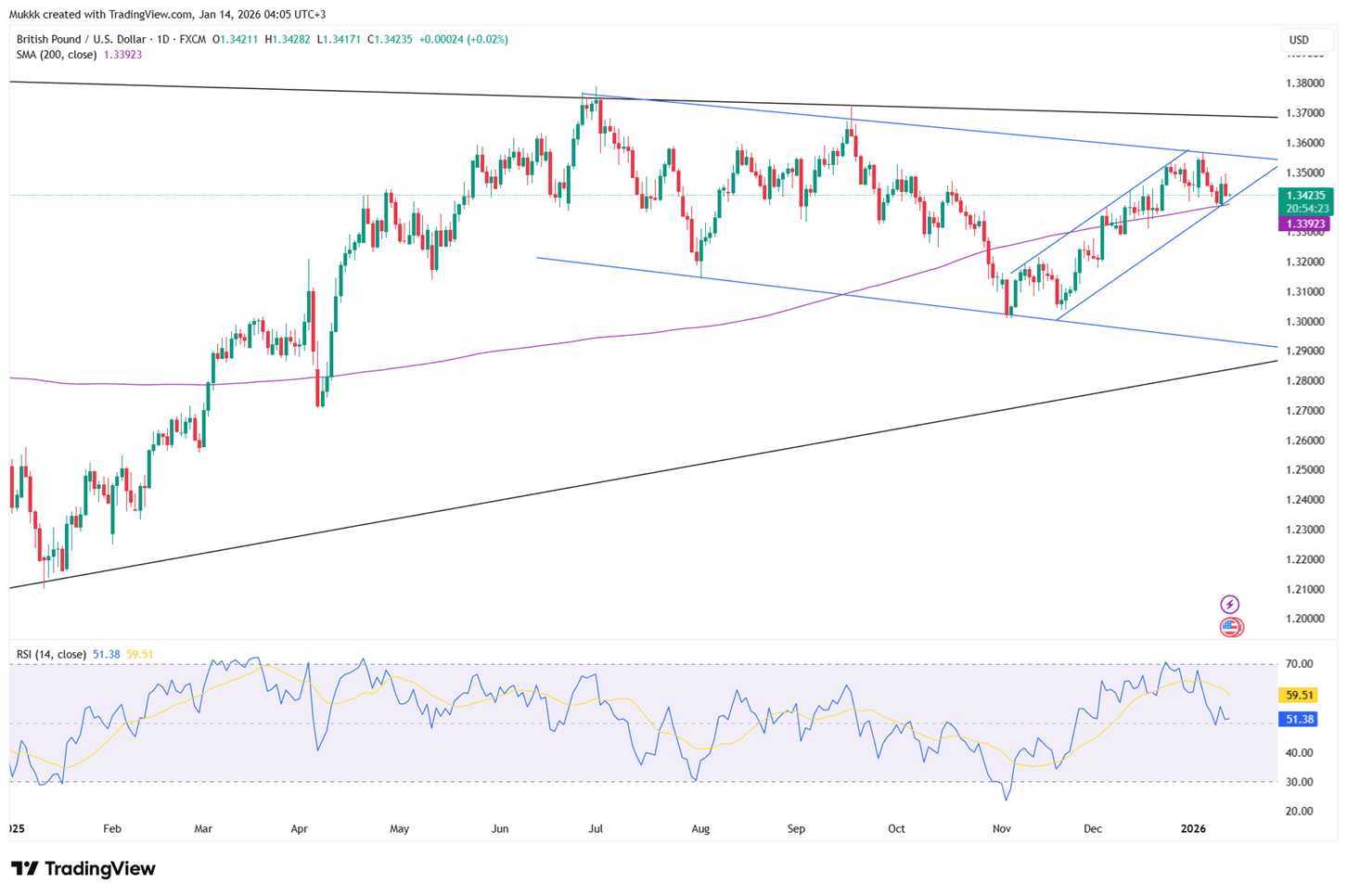The GBPUSD pair retreated toward 1.3425 during Wednesday's Asian session as the U.S. dollar regained its footing. While December's U.S. inflation held steady at 2.7%, investors are now pivoting toward today's Retail Sales and Producer Price Index (PPI) data for further direction. Despite the slight dip, sterling remains supported by ongoing political clouds surrounding the Federal Reserve.