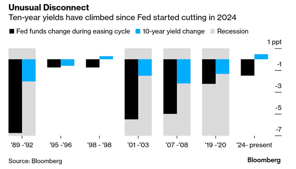 Instead of falling alongside policy easing, Treasury yields have been climbing since September 2024. Bloomberg notes that a divergence of this magnitude hasn’t appeared since the 1990s, raising questions about what today’s yield curve is really signaling.