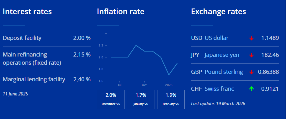 The European Central Bank kept its policy settings unchanged in March, but the message carried more weight than the decision itself. The main rate stands at 2.15%, the deposit rate at 2.00%, and the marginal lending facility at 2.40%. Stability in rates, however, contrasts with a shifting economic backdrop.